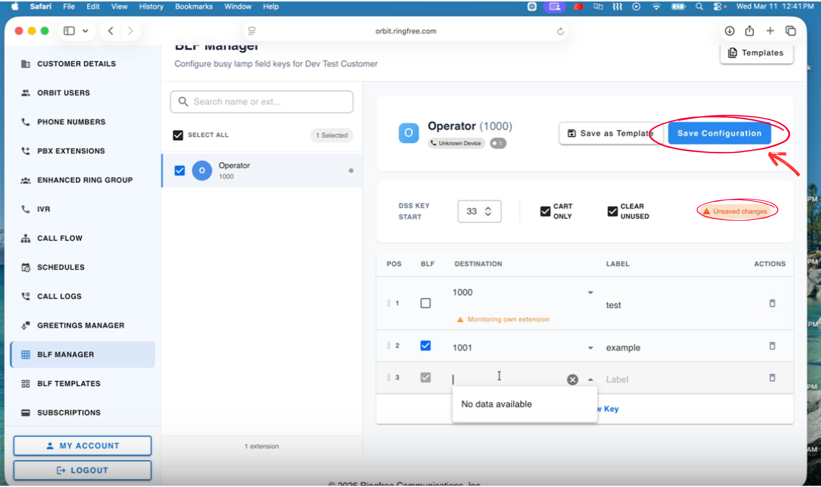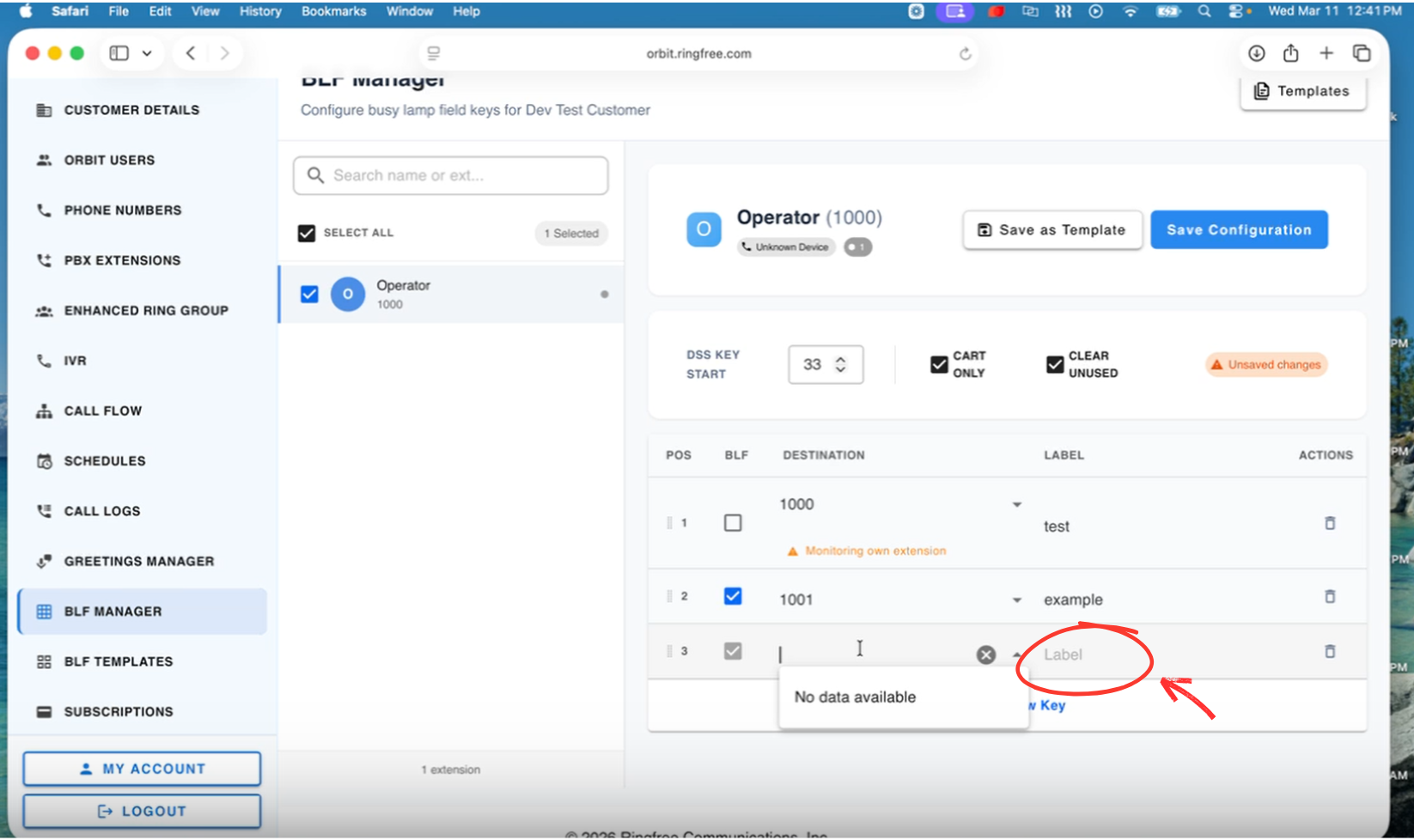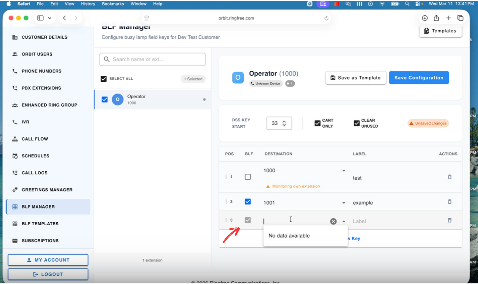 Once selected, the right side will load the BLF configuration for that extension.