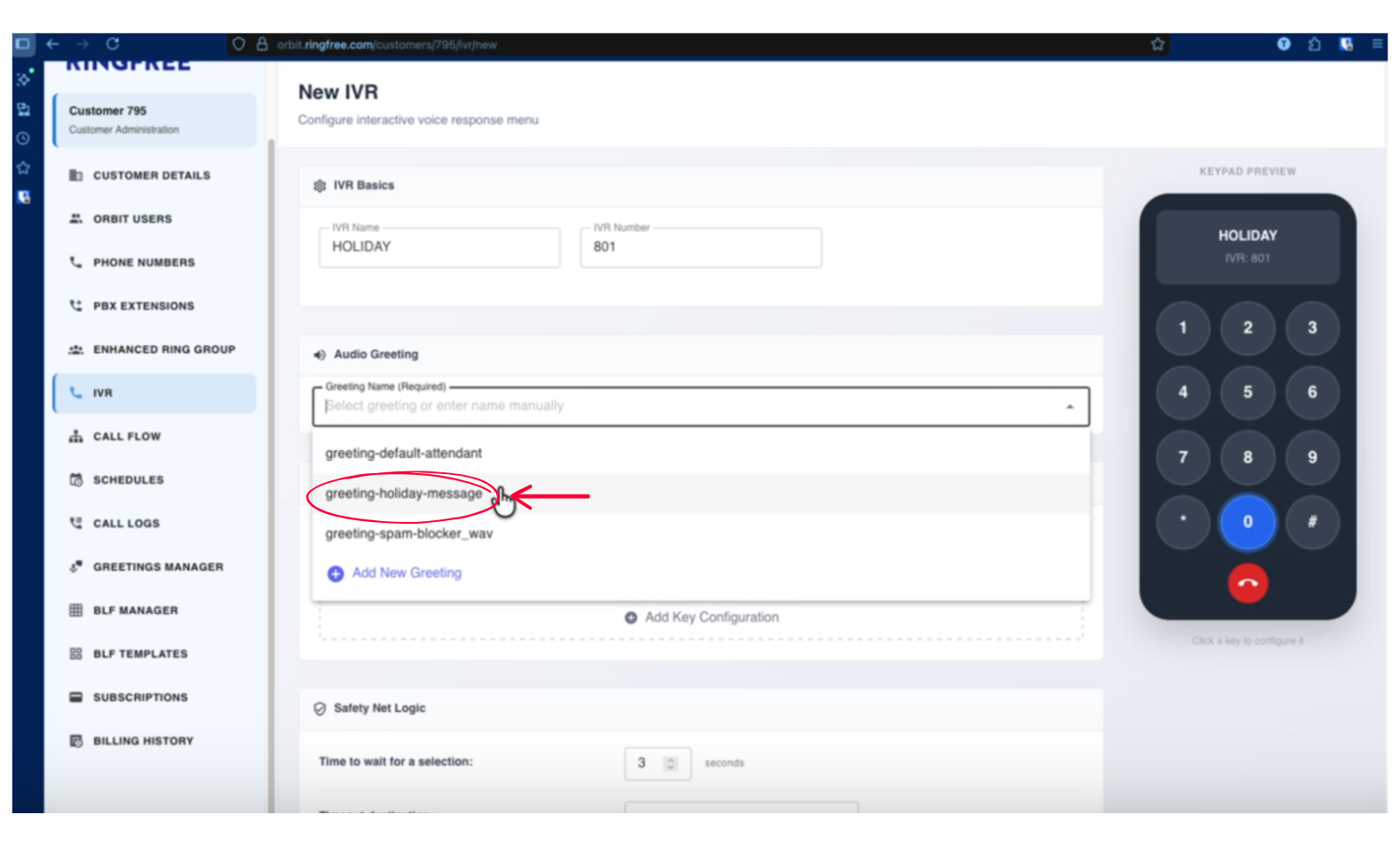Once applied, RingFree will play the holiday message on the date and time window you set.