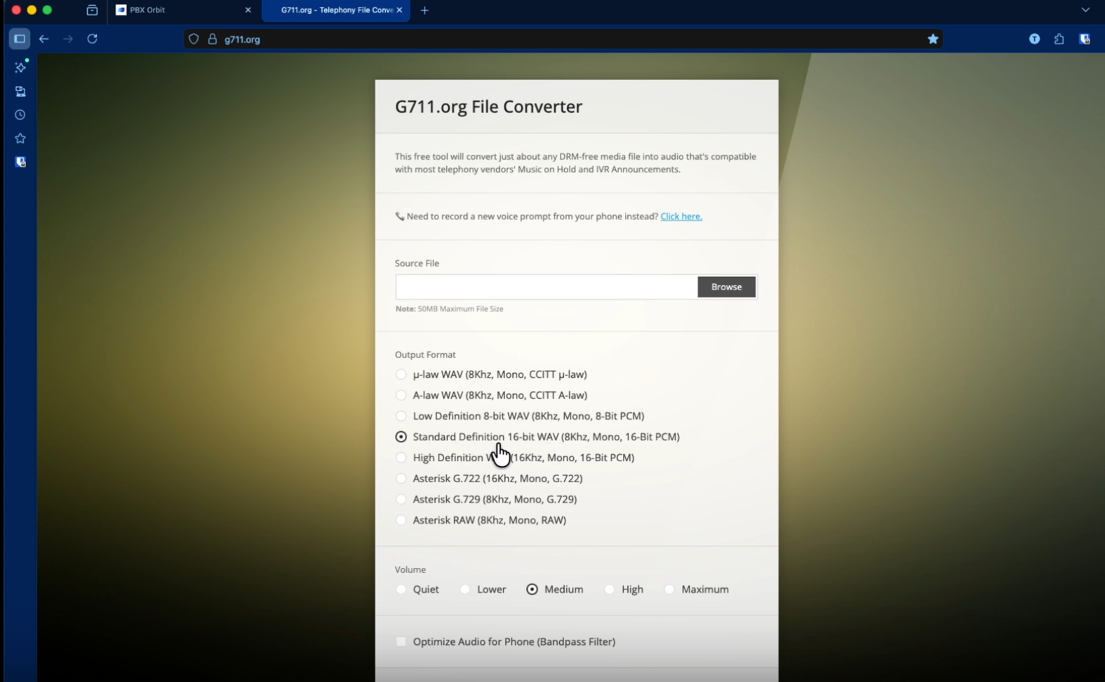 Convert it to 8kHz mono 16-bit PCM WAV using G711.org