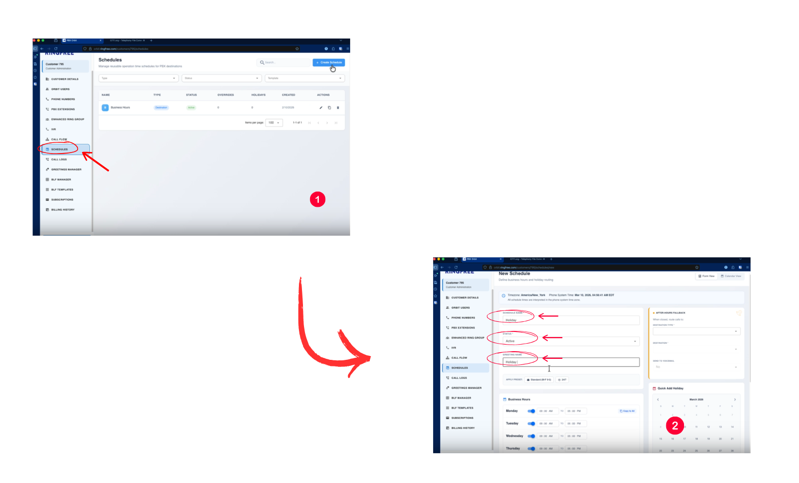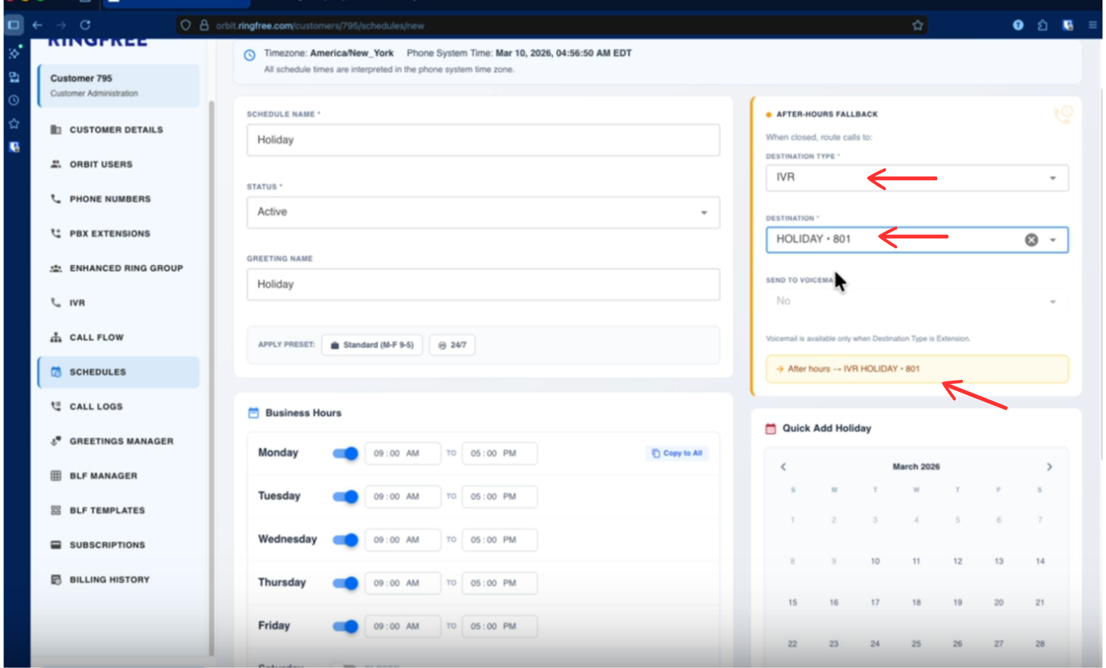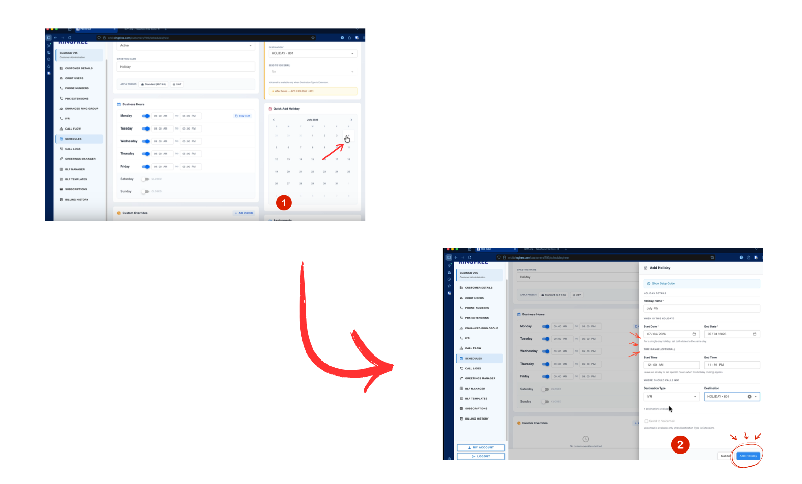 Schedules: add the holiday date(s) and point them to the holiday IVR