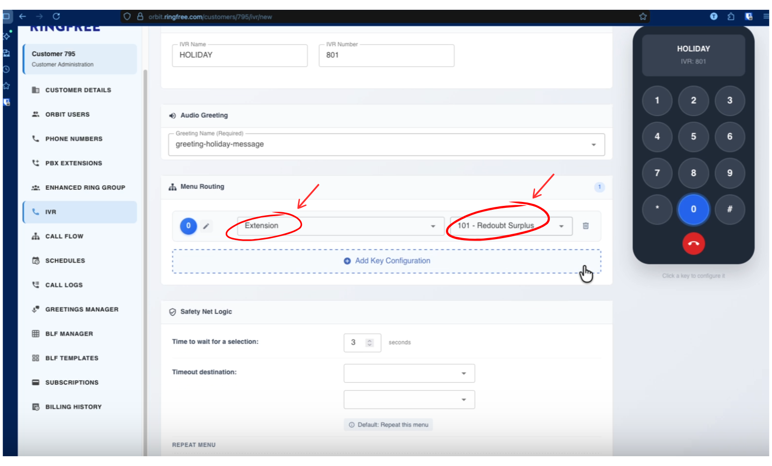 In Menu Routing, select a temporary option (example: Extension 101) so you can save the IVR.