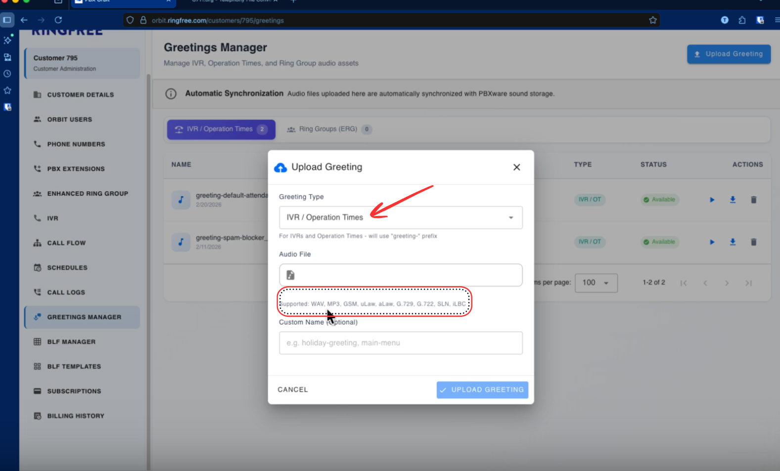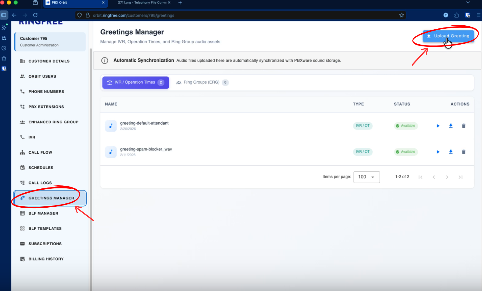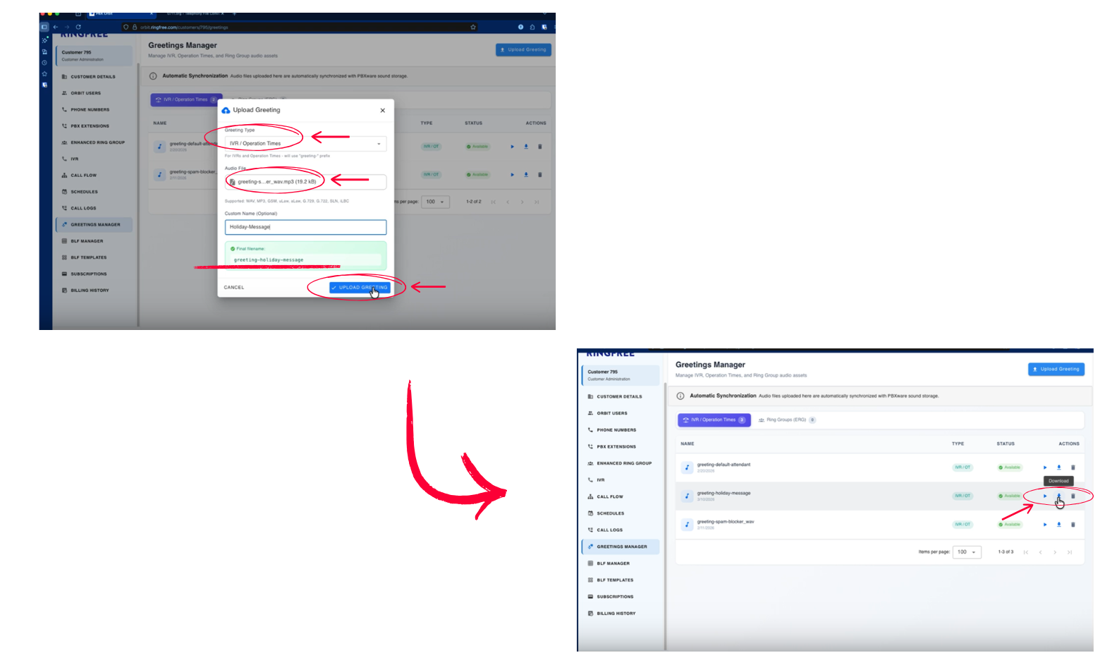 After upload, you should see the greeting listed in Greetings Manager. You can also play or download it from the Actions area to confirm it sounds right.