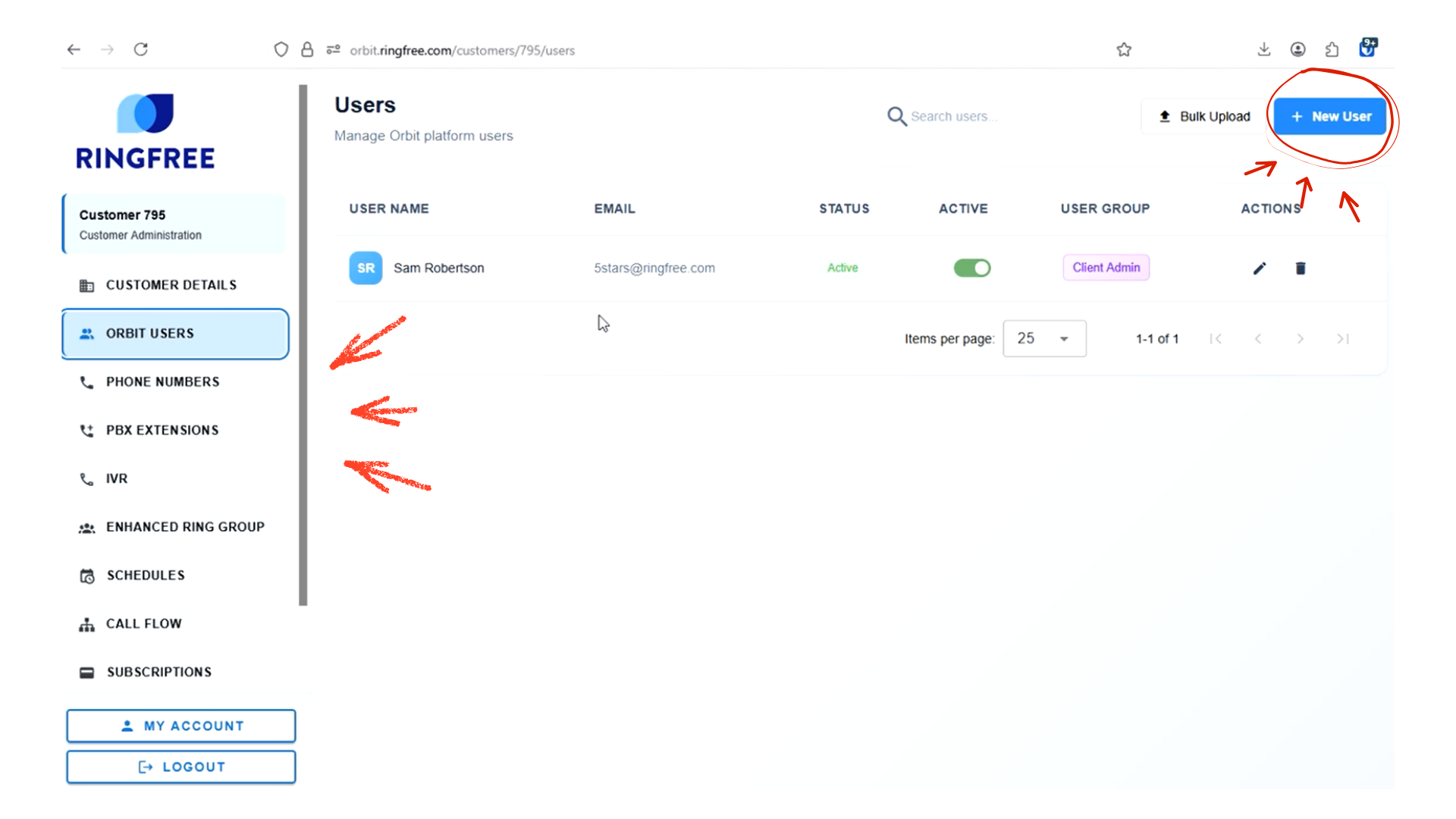 Find key admin menu items like Orbit Users, Phone Numbers, PBX Extensions, IVR, Ring Groups, Schedules, Call Flow, and Subscriptions