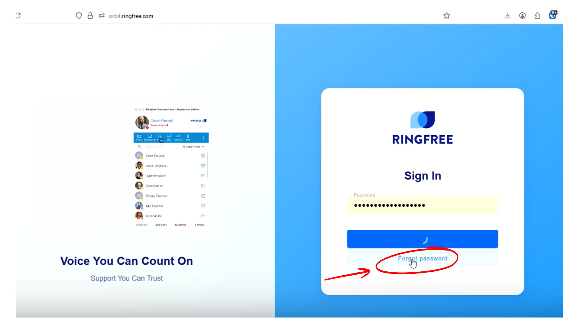 If you forgot your RingFree admin password, you can reset it from the Orbit login screen in a few minutes. After you reset it, you will land in your user profile area. From there, you can jump back into the admin side of the phone system using “Back to Customer”
