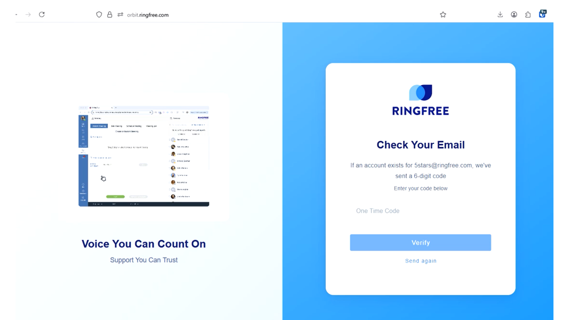 RingFree will send a one time code to the email address linked to your admin account.