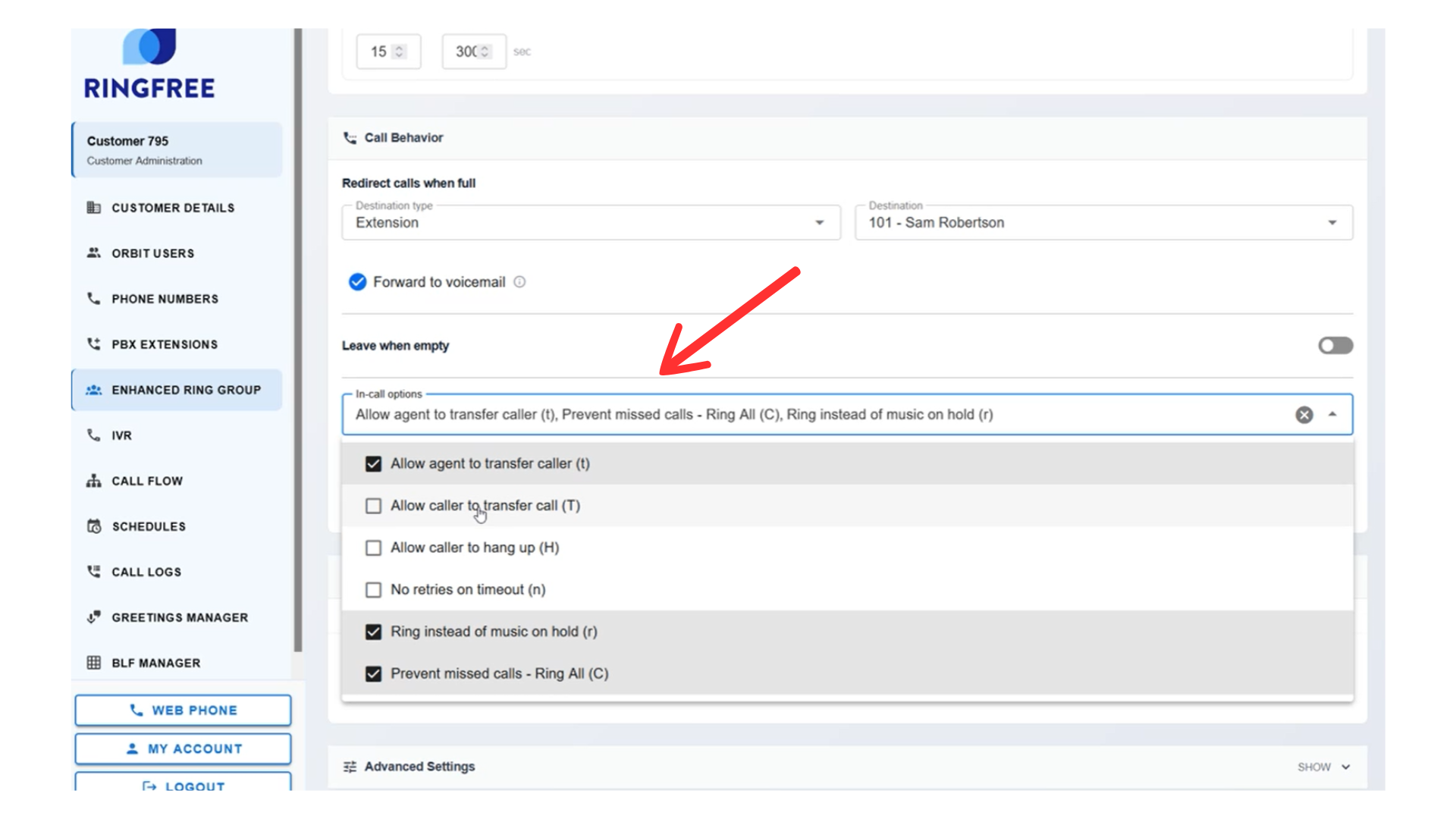 If you disable this, agents cannot transfer calls outside the ring group. This helps if you want tighter control of call routing.