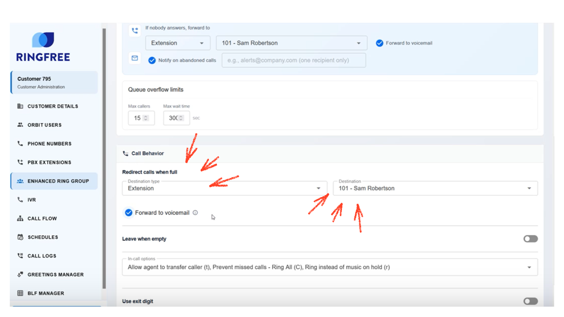 If your caller queue is full and your staff is already on calls, you can redirect new callers to a different destination.