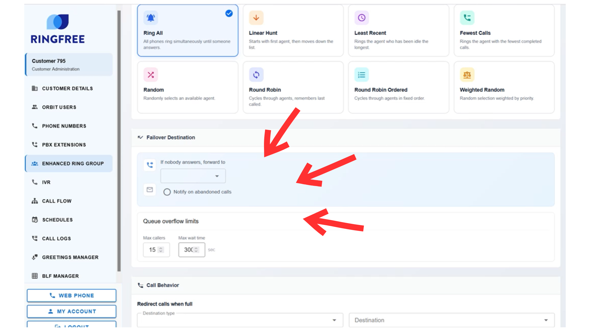 Choose a ring strategy (Ring All, Linear Hunt, and other options)