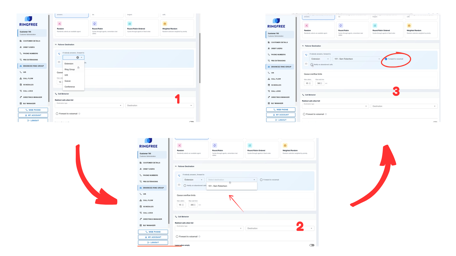A ring group is a call routing group that rings multiple extensions using a strategy you choose. If nobody answers, RingFree can send the call to a backup destination like voicemail, another ring group, or an IVR.